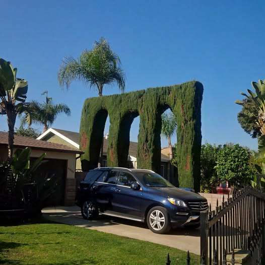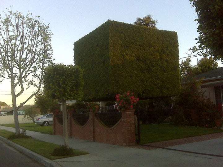 “My quest for the perfect Crime Against Horticulture is now complete, thanks for Andrew Cheeseman, hubby of Christy Wilhelmi, alias Garden Nerd. I don’t yet know where this resides, but somewhere in Los Angeles, George Jetson’s gardener is hovering above this tree, assuring that the top, sides and bottom are laser straight. Actually, I do appreciate the effort and finesse of the work. But it’s still SOOOO FREAKING WEIRD!!!!”