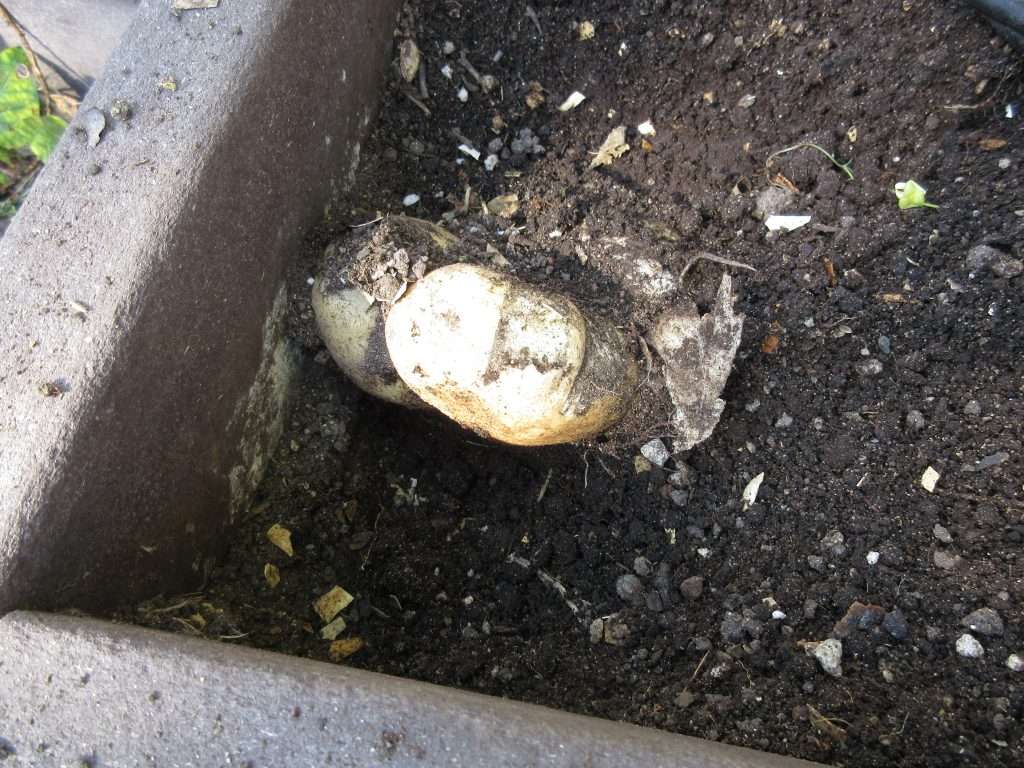By the end of the season one had died off, but the other sat there, with a vine only a few inches long. I excavated the soil and saw that the tuber was only the size of a ping-pong ball. Disappointing, but I covered it up and kept watering it.