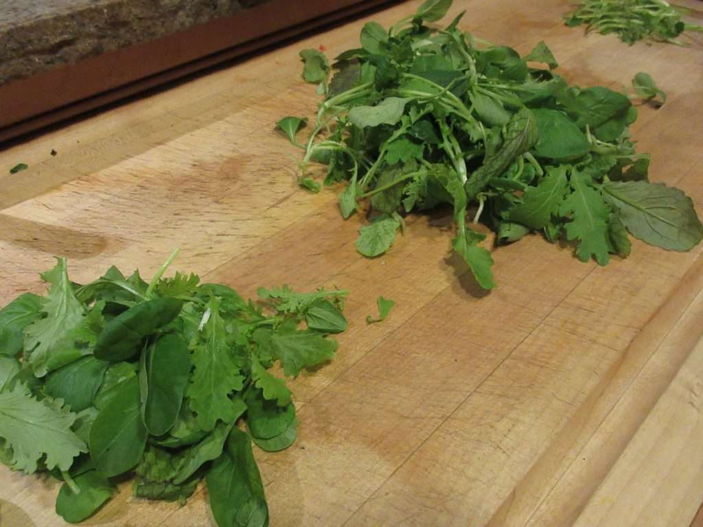 - 1 quart loosely packed baby mustard greens or spinach (about 5 ounces)