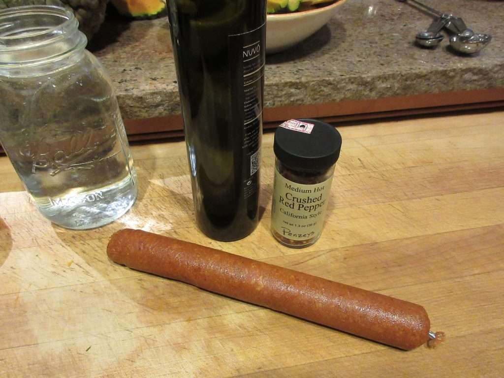 - ½ pound semi-dry Spanish chorizo or smoked kielbasa, cut into thin coins (We use soyrizo, which doesn’t slice)