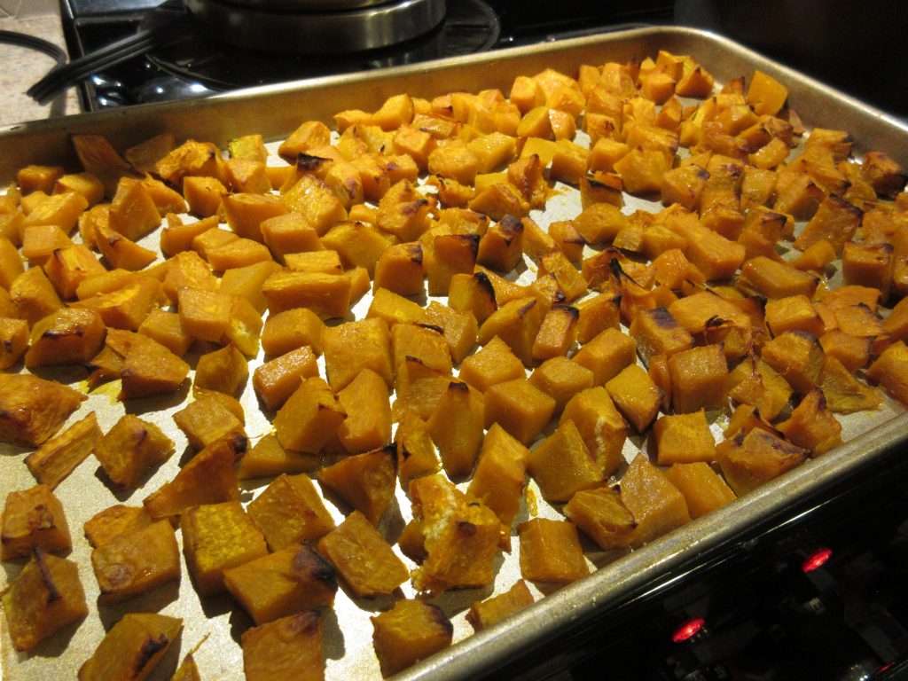 Roast pumpkin cubes on a baking sheet (lightly coated with olive oil, salt and pepper) at 400ºF until caramelized, about 20 minutes.