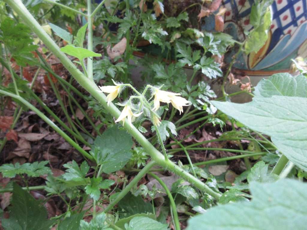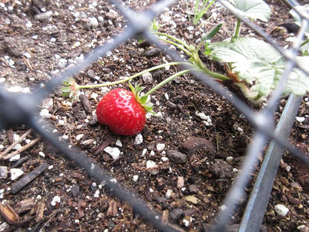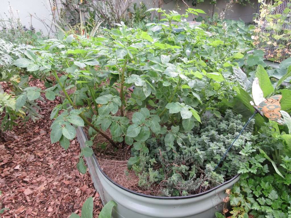 Potatoes are going gangbusters in this Vego Garden planter. Get your own here (our affiliate link helps support Gardenerd, and gives you a discount on your order).We love growing shelling peas as a cover crop over winter. Find out more about cover crops here. Celeriac grows along the edge of a raised bed. We will harvest and freeze cubes in another month or so. Ladybug larvae love aphids, and they’re feasting on them on this artichoke plant. Our first strawberry of the season always arrives in winter. These new plants are protected under deer fencing.Loquats are a sub-tropical fruit that doesn’t transport well, so growing them is essential if you love their sweet, tangy flavor. They are ripening to golden yellow.After a good winter pruning, the blackberries are starting to leaf out for the season. There is still time to cut back your blackberries if you haven’t done it yet. Even in winter, volunteer tomatoes start to flower. We love volunteers!A recent heatwave forces these green onions to bolt to seed. Speaking of which…