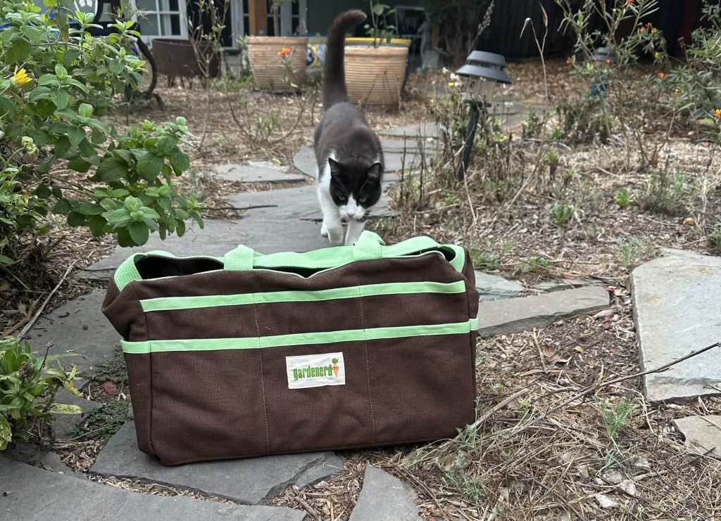 Pomegranate tree leaves are turning yellow, ready to fall off in dormancy. It was a good season this year. Pineapple sage is finishing up its flowers for the season. Time to prune when it’s done. Mittens approves of our sale on the Ultimate Garden Bag. Get yours before they’re gone!